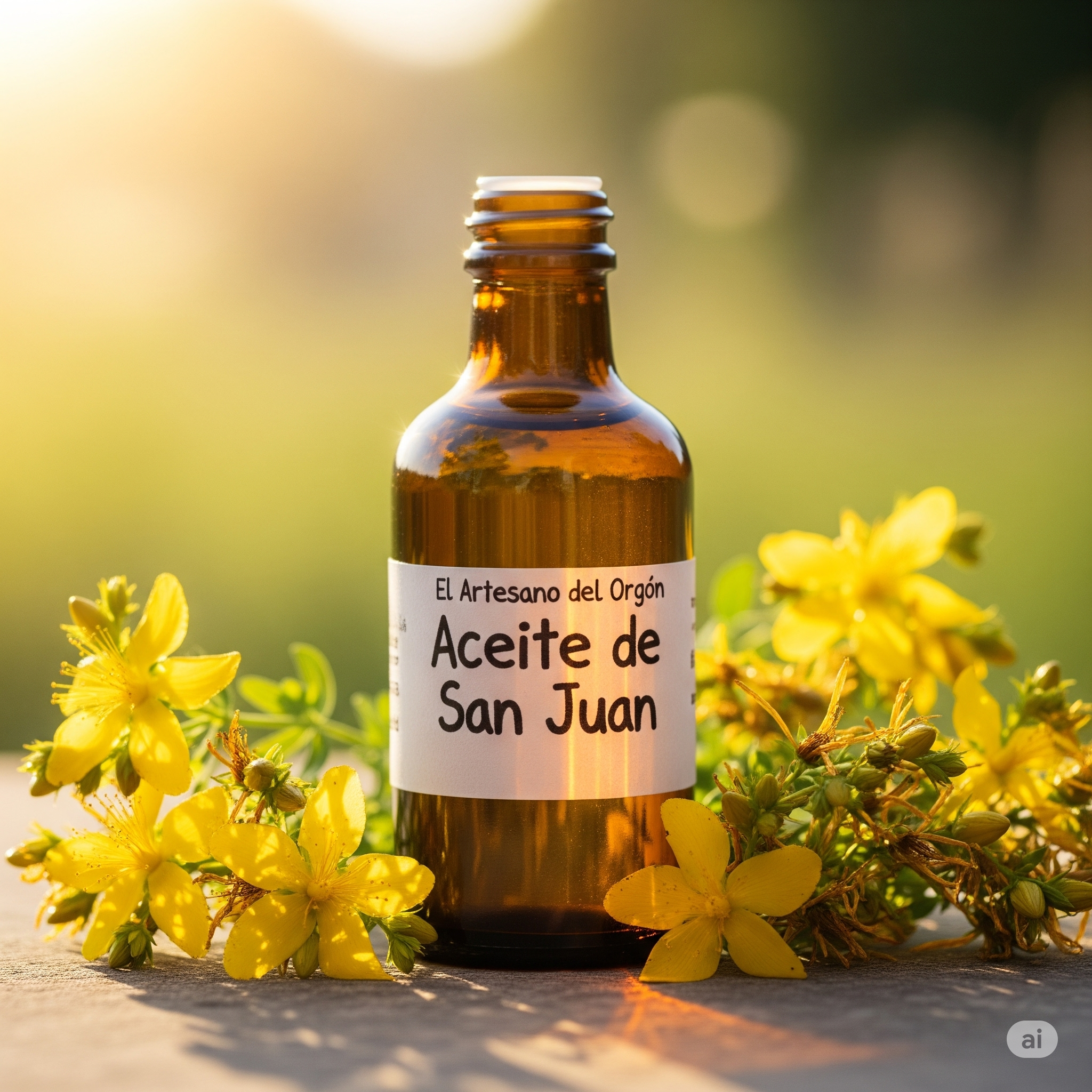 Aceite natural elaborado de forma artesanal a partir de flores silvestres de Hypericum perforatum, recolectadas a mano en plena floración y maceradas durante más de 40 días en aceite de oliva virgen extra ecológico. El proceso se realiza al sol y a la sombra, según la tradición ancestral, sin añadir conservantes ni perfumes.