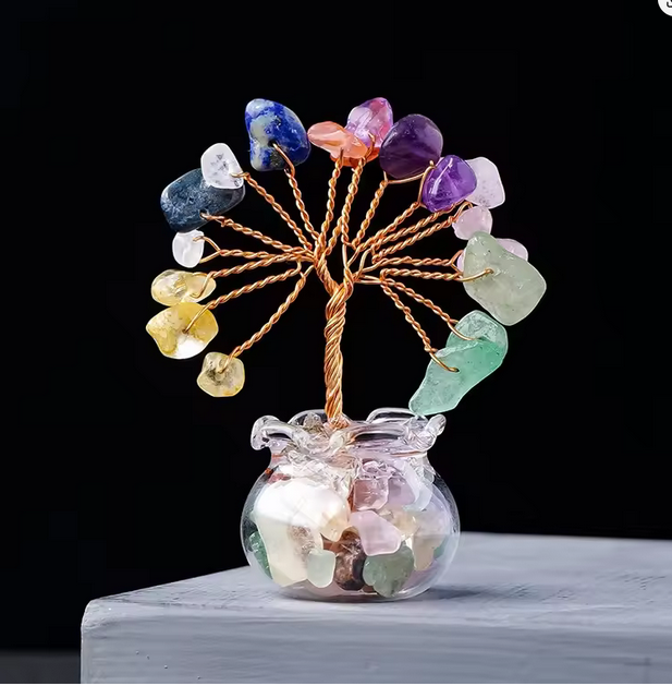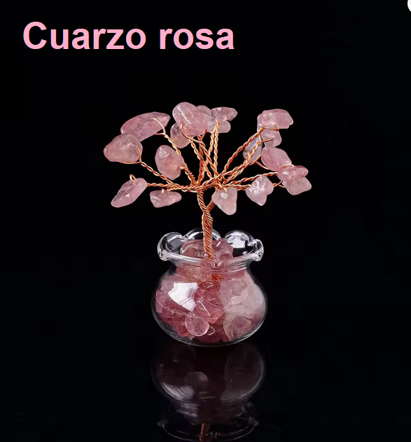 Árbol decorativo hecho a mano con piedras de cuarzo rosa natural y base de cristal pulido, ideal para atraer amor, calmar emociones y armonizar espacios. Perfecto para Reiki, Feng Shui, Yoga o como regalo espiritual.
